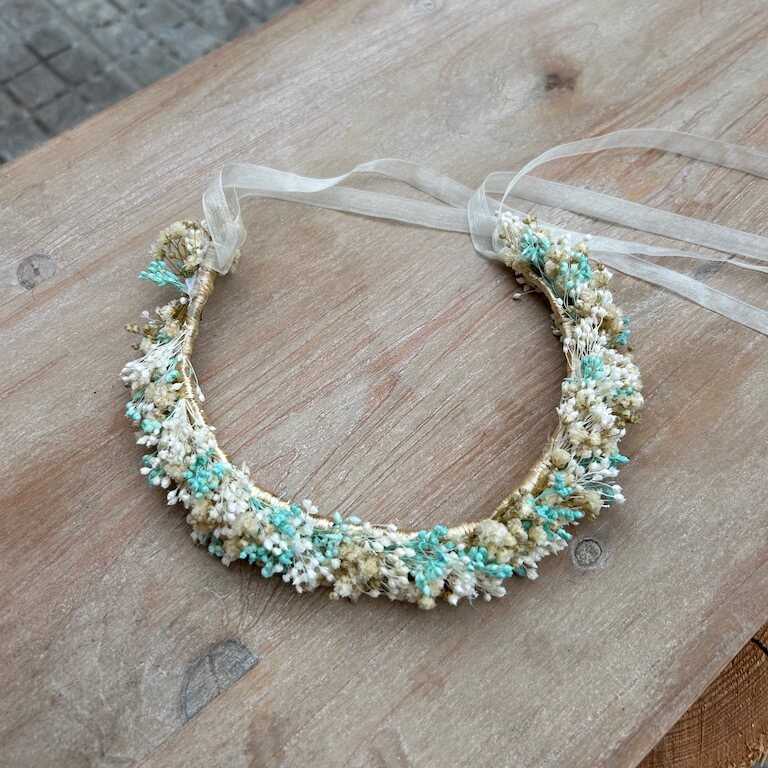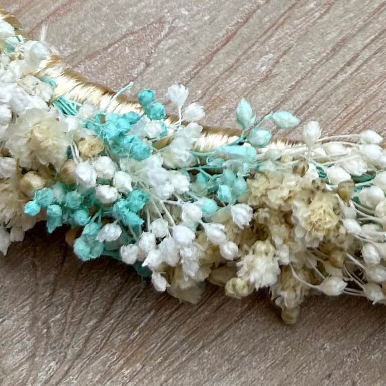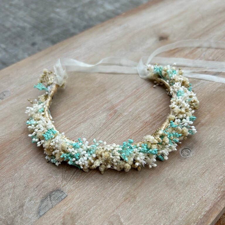 Lo que hace especial a esta corona de flores blancas y turquesas es el uso de materiales naturales tratados. Al ser flores preservadas, el tocado mantiene su aspecto fresco, suave y flexible durante años, evitando que las flores se vuelvan quebradizas.